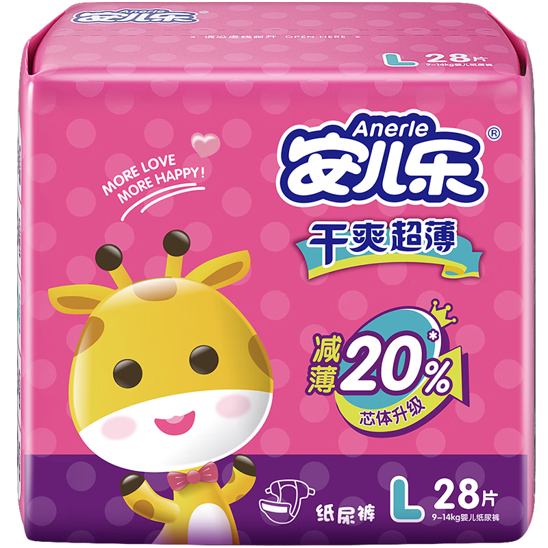 安儿乐的纸尿裤以剪裁合身、干爽超薄著称,深受家长们的青睐。例如,安儿乐ANERLE干爽超薄纸尿裤L28片(9-14KG)不仅在设计上注重宝宝的舒适度,还在材料选择上严格把关,确保每一片纸尿裤具备优异的吸水性和透气性,有效防止尿布疹的发生,让宝宝时刻保持干爽舒适。