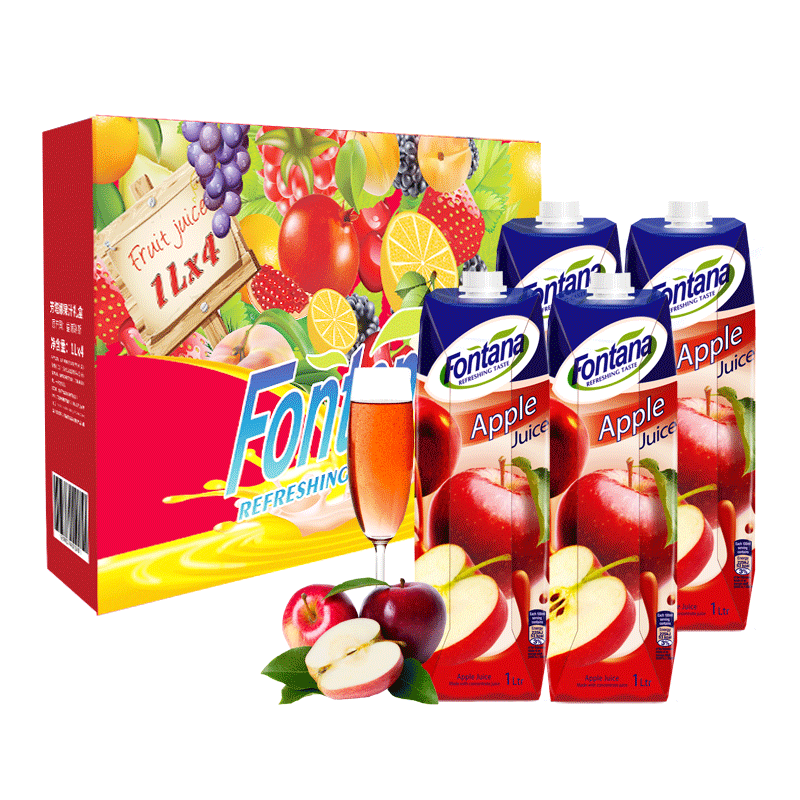 地中海塞浦路斯进口 芳塔娜(Fontana)苹果汁100%纯果汁 1L*4瓶 果汁饮料 整箱礼盒 -