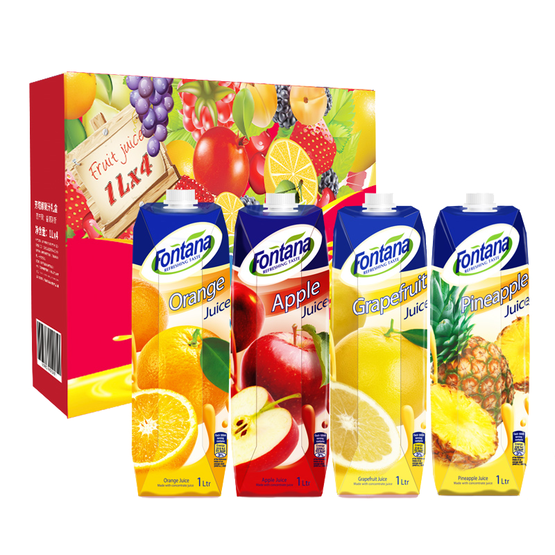 地中海塞浦路斯进口 芳塔娜(Fontana)四种口味100%果汁 1L*4瓶 果汁饮料 礼盒装 -