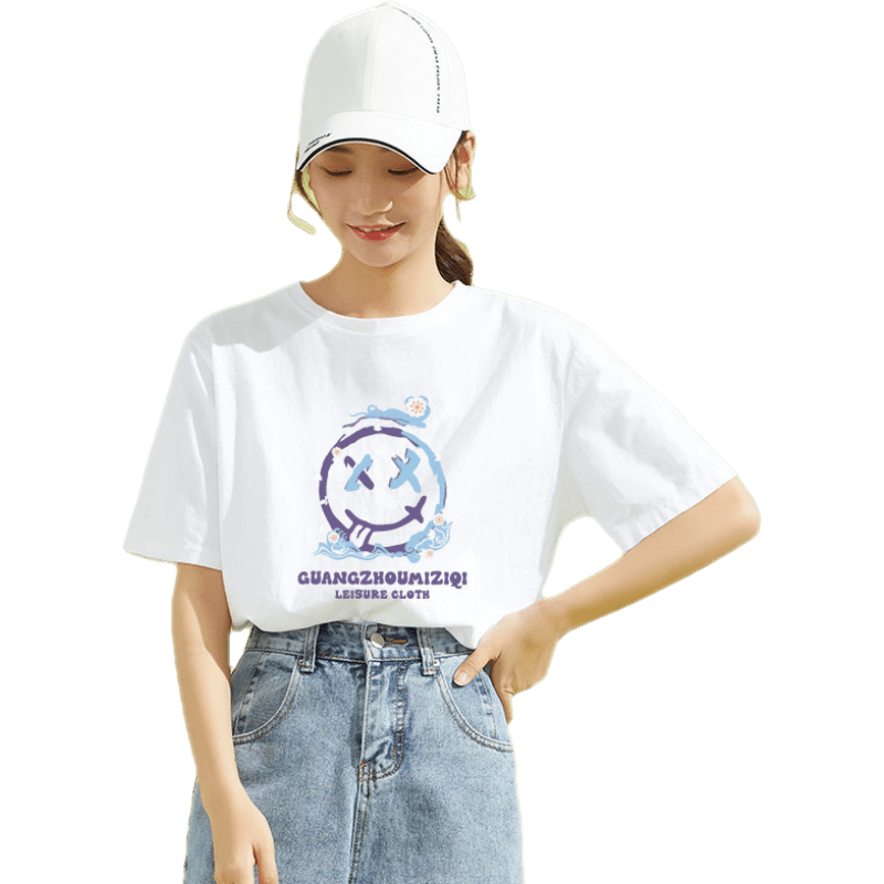 米子旗 纯棉短袖t恤女宽松流行时尚上衣2021新款夏季百搭半袖体恤 5160胸前大 米白 L 110-120斤
