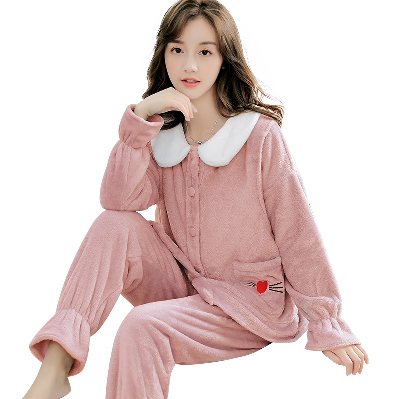 【秋冬法兰绒】钱塘娘子月子服秋冬厚款孕妇哺乳睡衣怀孕期产后喂奶衣保暖加厚宽松珊瑚绒套装 粉色猫咪口袋【双面绒】 L码-推荐115-130斤穿 -